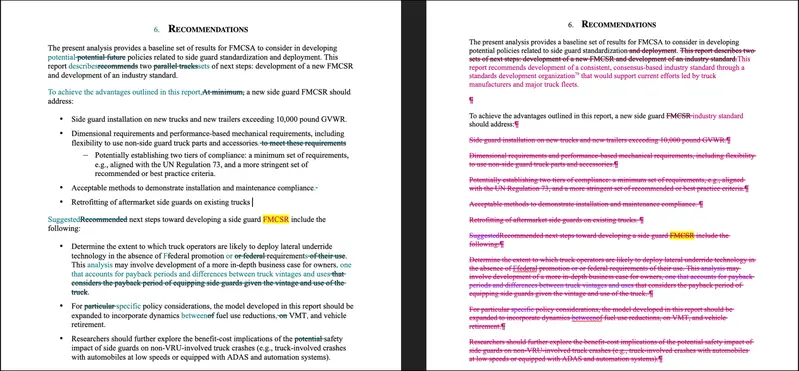 Drafts of a report by Volpe Center researchers before (left) and after government officials assured industry lobbyists that the report would not include any regulatory recommendations.