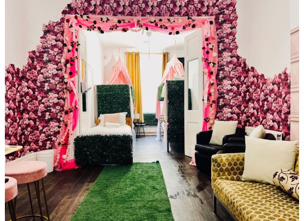 Now, let's talk about the decor. The walls are adorned with garish pink rose wallpaper, rainbows, and pink princess bed canopies. Not exactly everyone's cup of tea, but to each their own, right? And let's not forget the fake ivy hanging from the ceiling. It may not be to everyone's taste, but hey, at least it adds some greenery to the space.